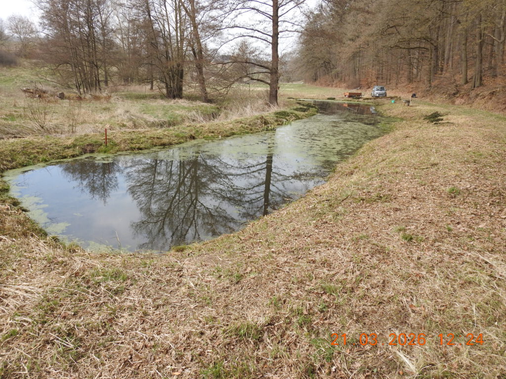 Die Teichanlage hat sich sehr gut entwickelt. Die letztjährigen Abdichtarbeiten waren erfolgreich. Der Wasserstand ist im Jahresverlauf stabil hoch. Gespeist wird der Teich durch eine frei gelegte Quelle im Rahmen der Renaturierung in 2018.